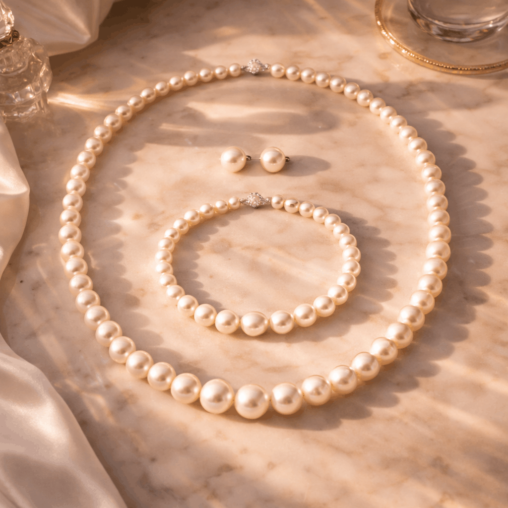 Επιπλέον, αποθήκευσε το πλήρες σετ σου μαζί σε μια μαλακή θήκη κοσμημάτων, κρατώντας τα κομμάτια χωριστά ώστε να μην χαράζουν το ένα το άλλο. Ποτέ μην αποθηκεύεις πέρλες σε εντελώς σφραγισμένες πλαστικές σακούλες – χρειάζονται υγρασία από τον αέρα για να παραμείνουν υγιείς. Οι πέρλες θα στεγνώσουν πραγματικά και μπορεί να ραγίσουν σε αποθηκευμένο χώρο χωρίς αέρα με τον καιρό. Τέλος, φόρα το σετ σου περιστασιακά μετά τον γάμο σε ειδικές περιστάσεις. Τα φυσικά έλαια του δέρματός σου βοηθούν να διατηρηθεί αυτή η υπέροχη λάμψη. Αυτά τα κομμάτια είναι φτιαγμένα για να τα φοράς και να τα απολαμβάνεις – όχι για να μείνουν κρυμμένα για πάντα σε ένα συρτάρι μαζεύοντας σκόνη.